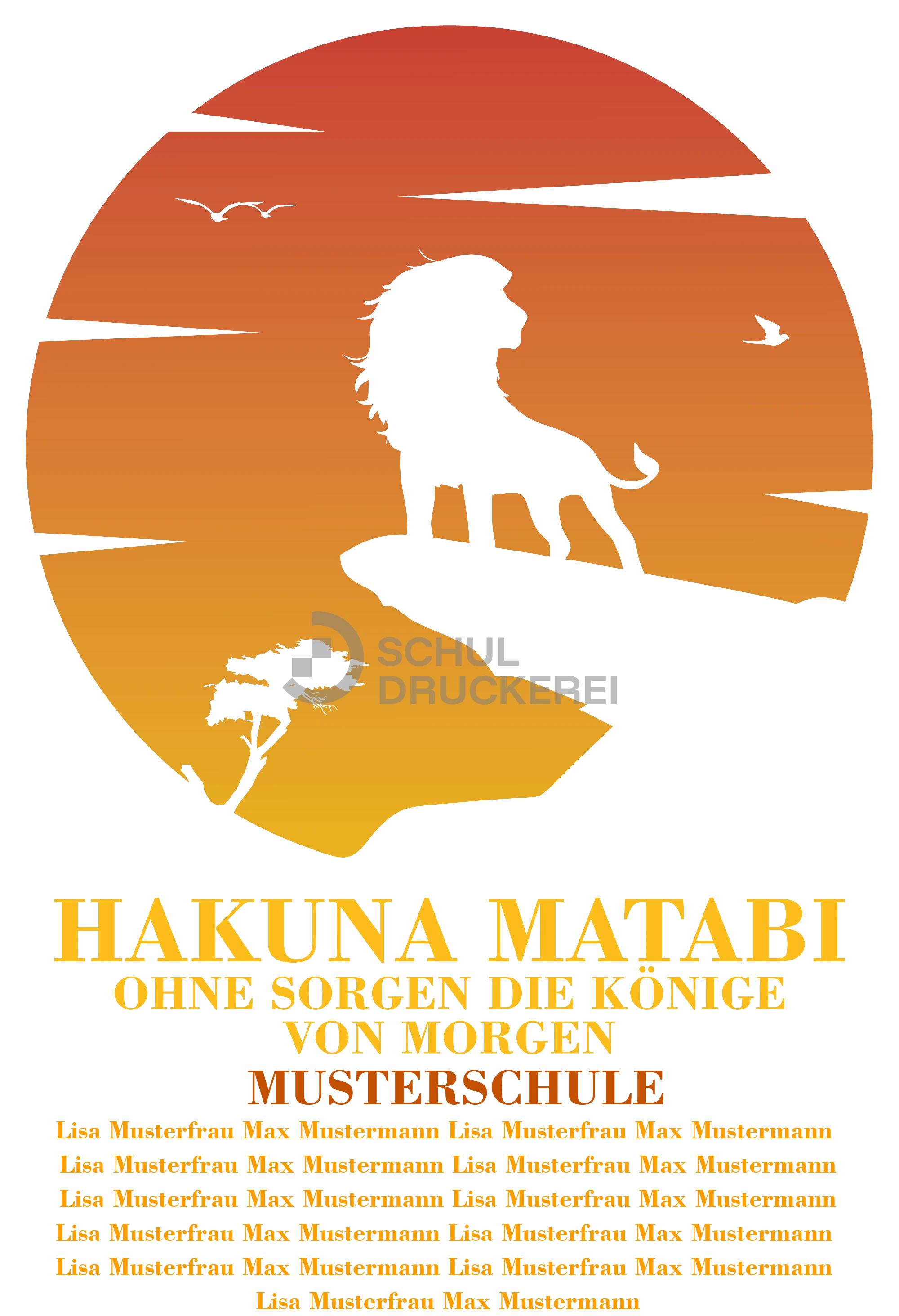 Mit Hakuna Matabi Ohne Sorgen feierst du dein Abi entspannt wie ein König der Savanne, denn der eindrucksvolle Löwe vor dem orangefarbenen Sonnenuntergang erinnert dich daran, dass du ohne Sorgen in deine Prüfungsphase starten kannst, während du zugleich deine Klassenkameraden motivierst und gemeinsam voller Stolz euren finalen Schulabschnitt abschließt, um anschließend voller Zuversicht die Zukunft zu erobern.